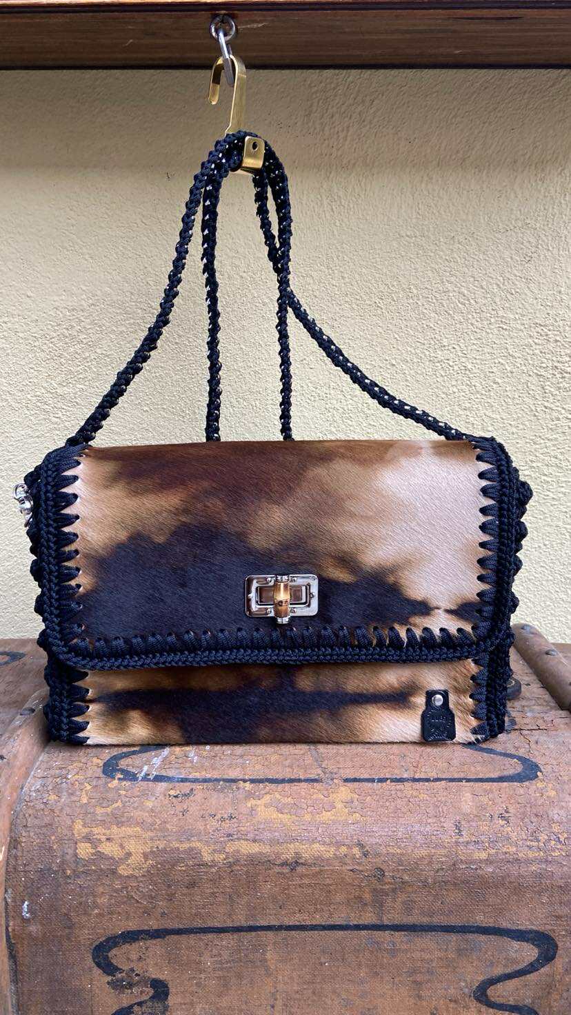 Borsa in cavallino e cordino lavorato all'uncinetto con tracolla in catenella ricoperta con cordino. Pezzo unico.