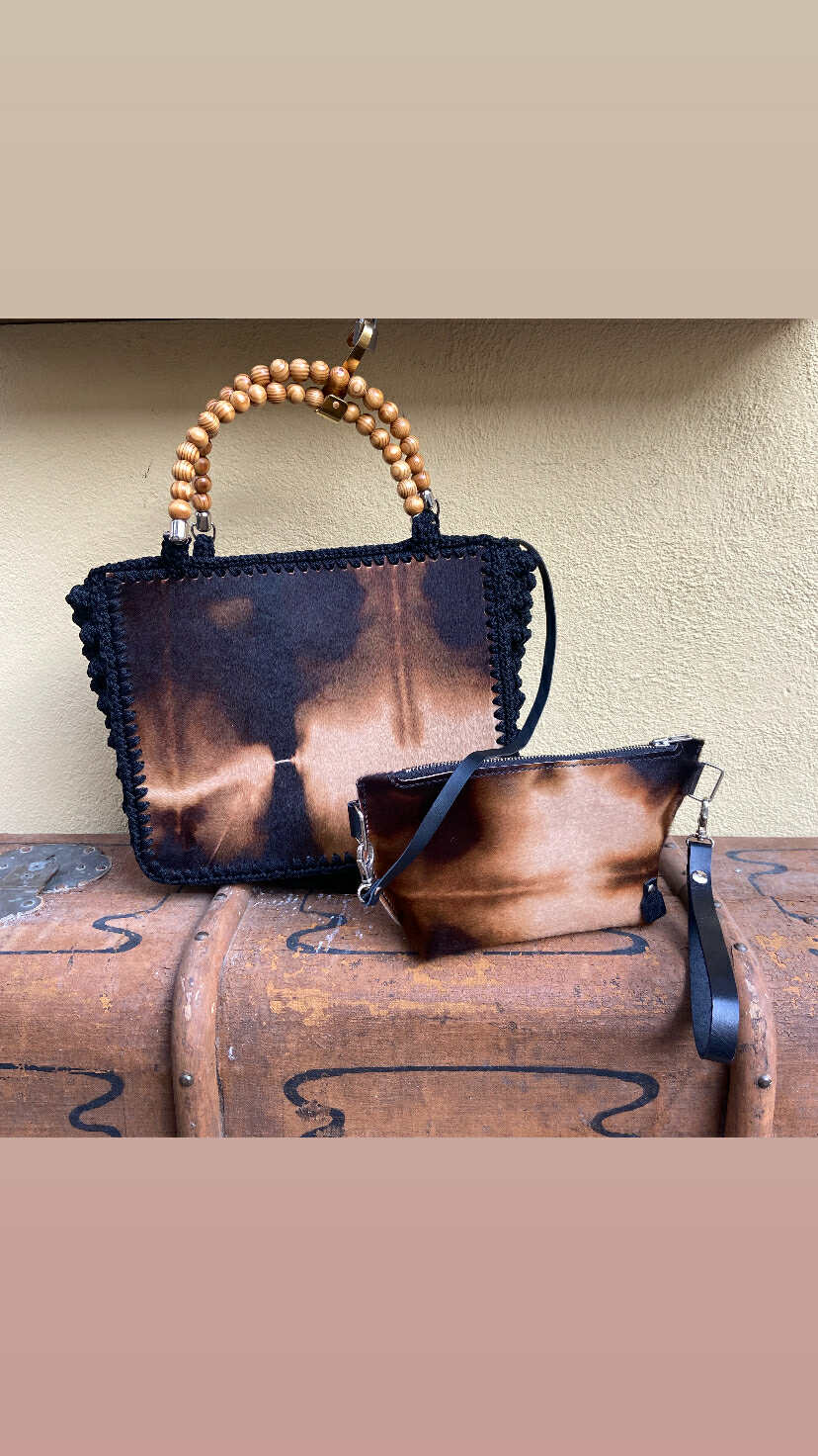 Borsa in cavallino e cordino lavorato all'uncinetto con manico in palline di legno e pochette abbinata removibile . Pezzo unico.