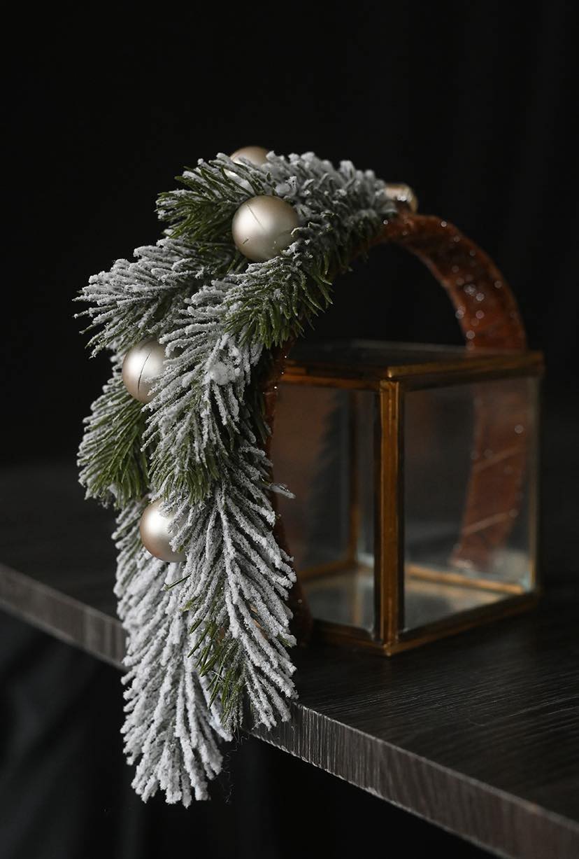 con ramo di abete innevato, palline di Natale e Swarovski
