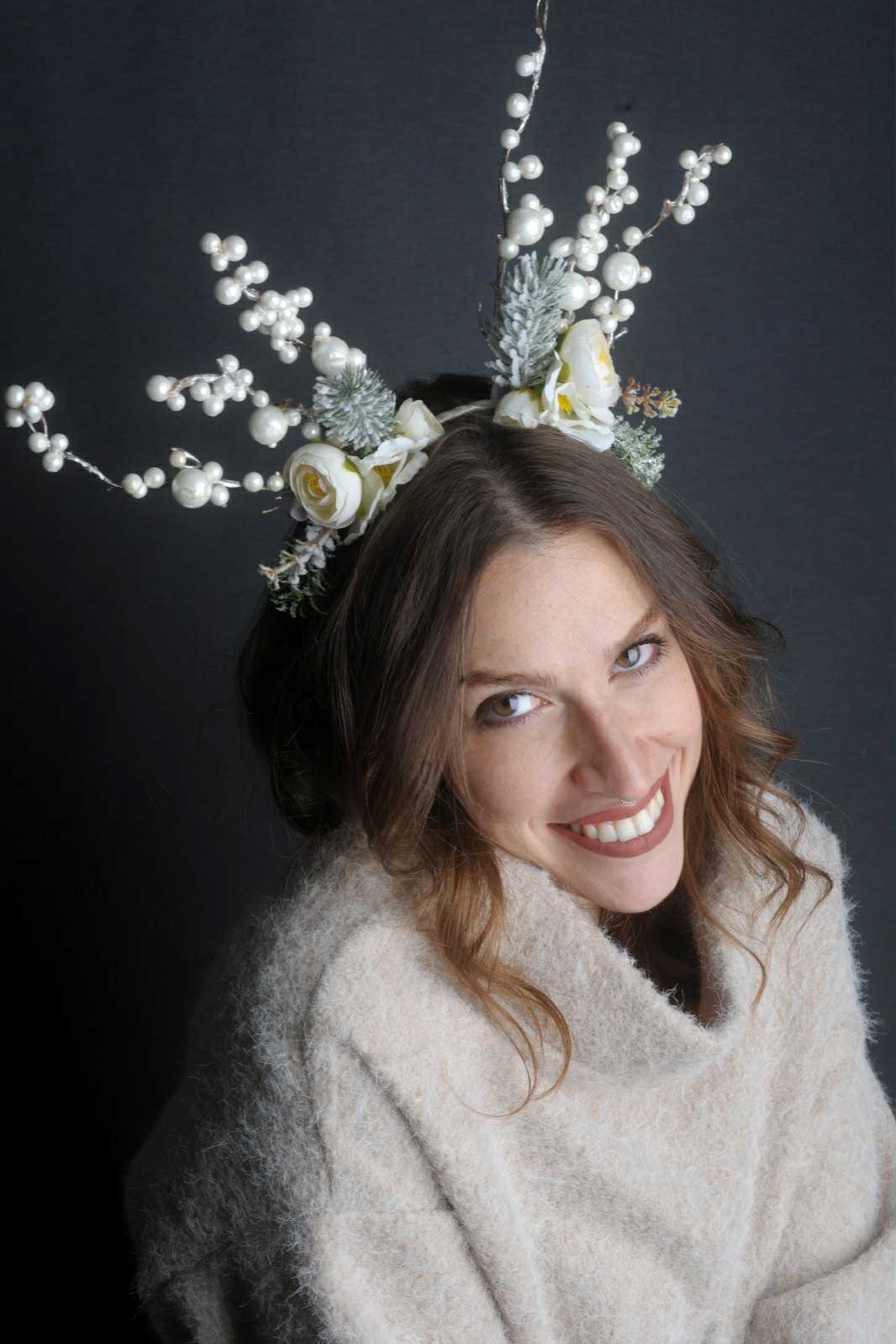 Cerchietto con rametti di bacche bianche e fiori.