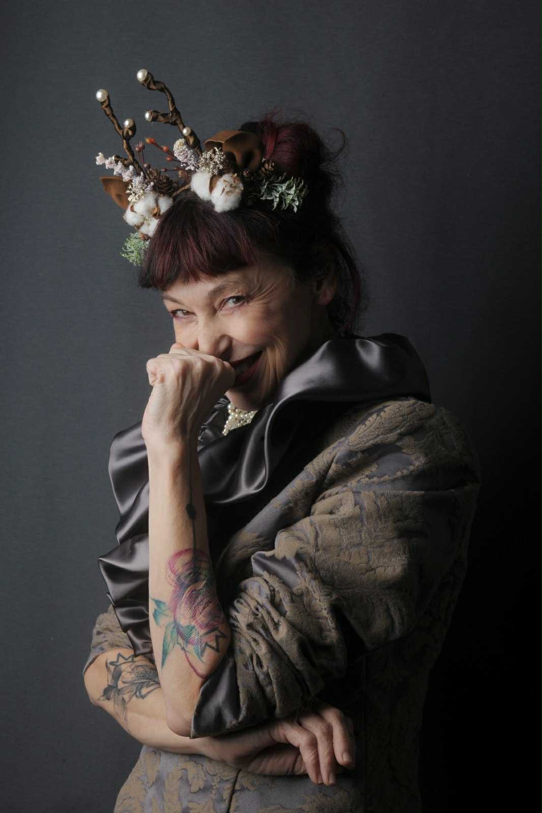 Cerchietto con orecchie in pelle, fiori di cotone e corna in raso e perle.