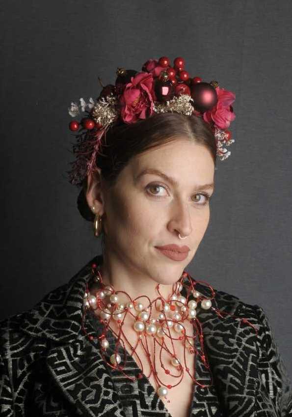 Cerchietto ricoperto di velluto con fiori, frutta rossi e palline di Natale