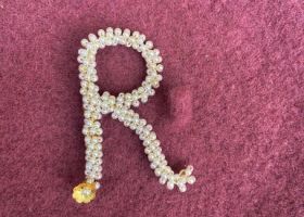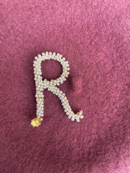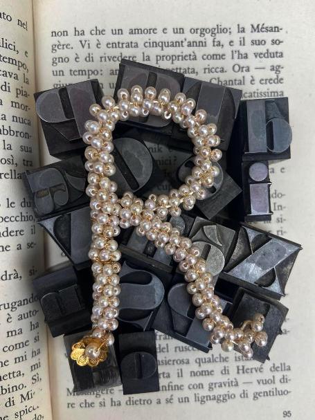 Spilla monogramma con filigrana e perline. Materiali free nikel.