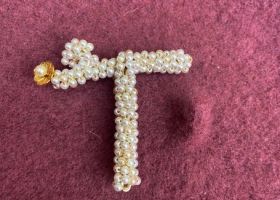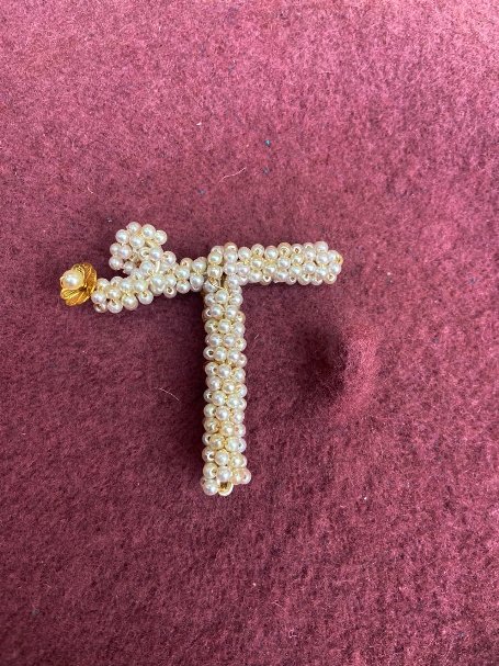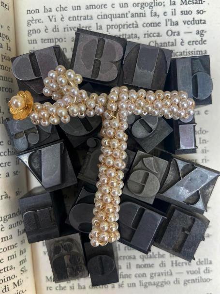 Spilla monogramma con filigrana e perline. Materiali free nikel.