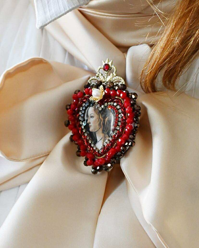 Spilla con immagine di Simonetta Vespucci stampata su canvas e intrecci di perline e filigrane.