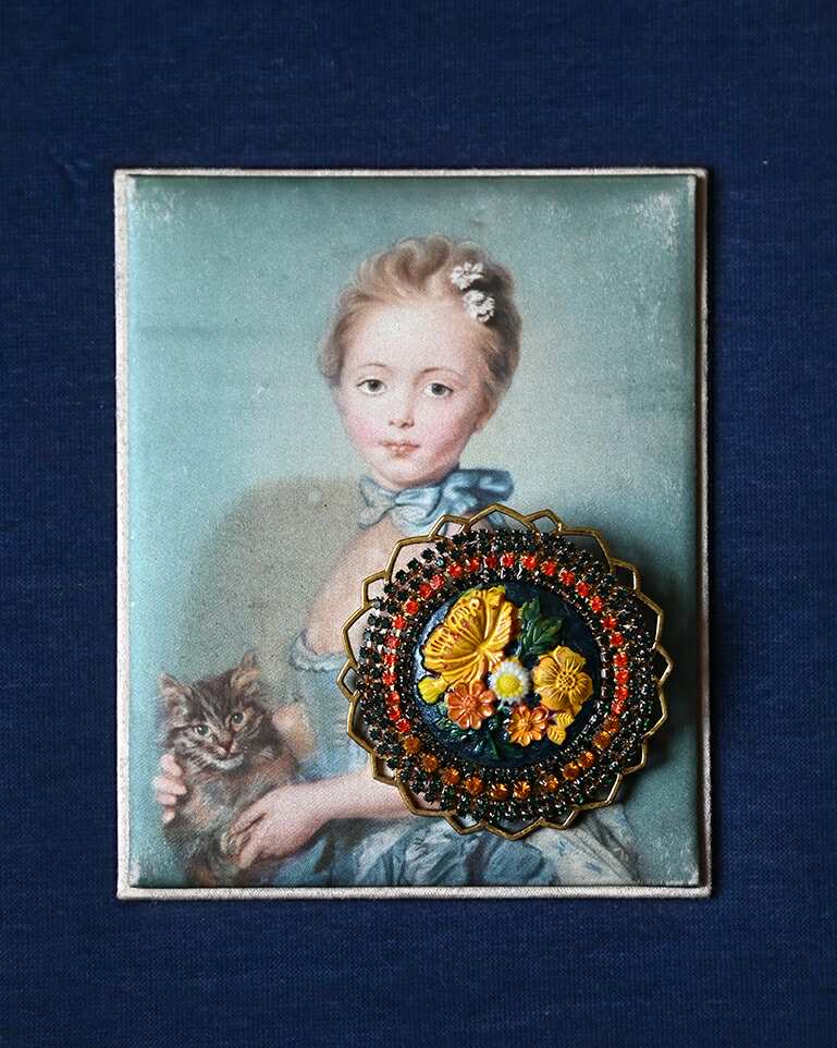 Spilla con cameo in resina e catene swarovski su filigrana.