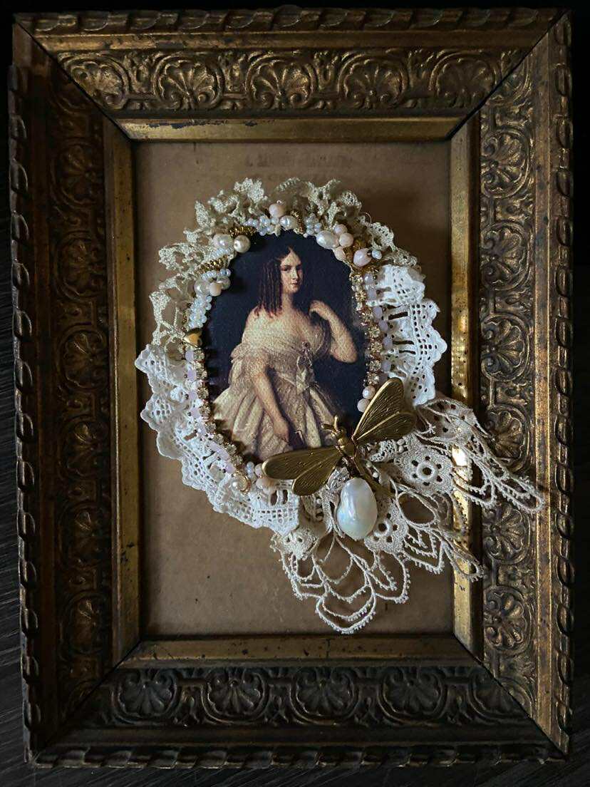 Spilla con immagine stampata su canvas, ricamata con pizzi, perle, cristalli e filigrane.