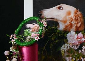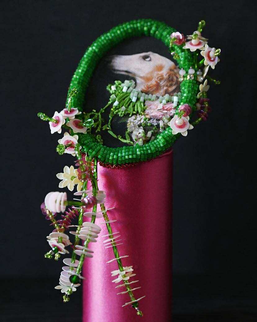 Spilla con immagine personalizzata stampata su canvas, ricamata con perline di conteria veneziana in vetro e paillettes.