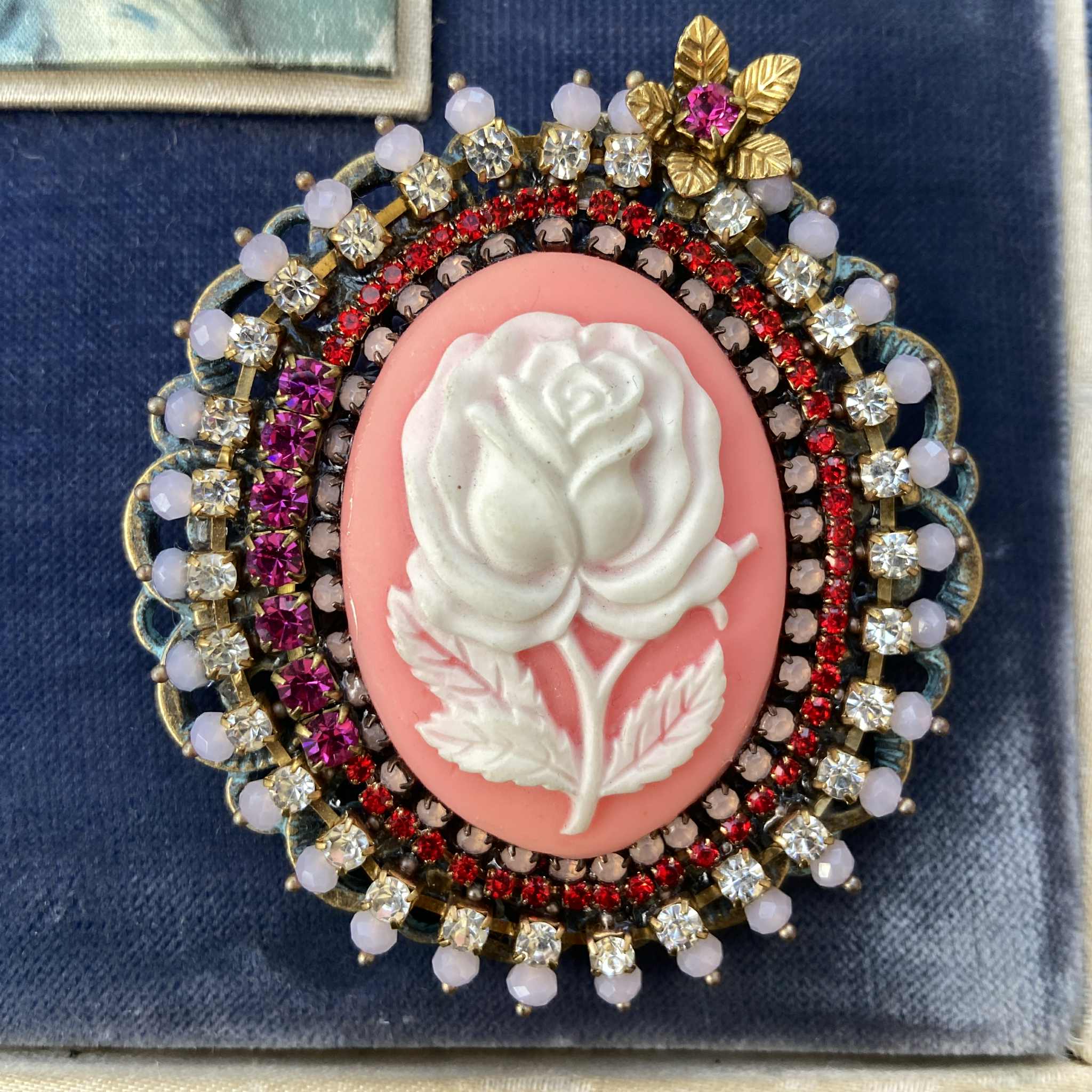 Grande spilla con cameo in resina su filigrana con catene Swarovski. Materiali free nikel.