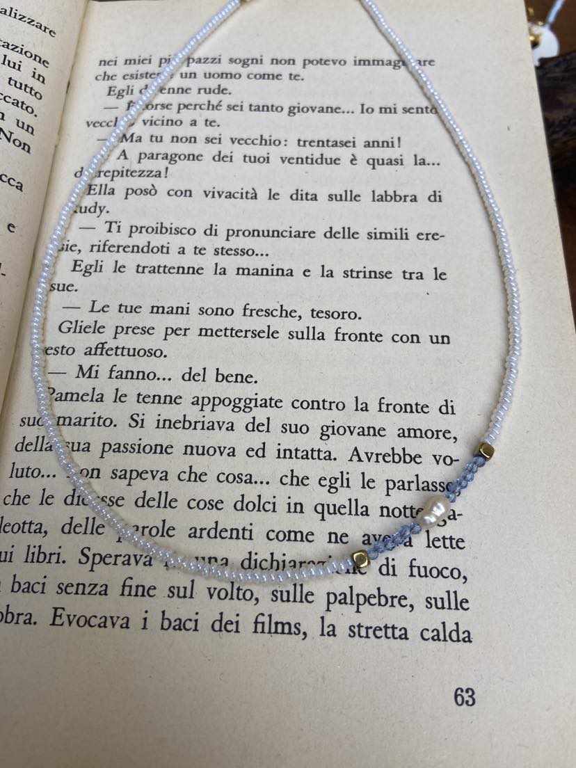 Sottili girocolli con conteria veneziana, perle coltivate, zirconi sintetici, ematite e pietre dure.