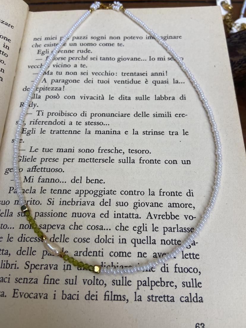 Sottili girocolli con conteria veneziana, perle coltivate, zirconi sintetici, ematite e pietre dure.