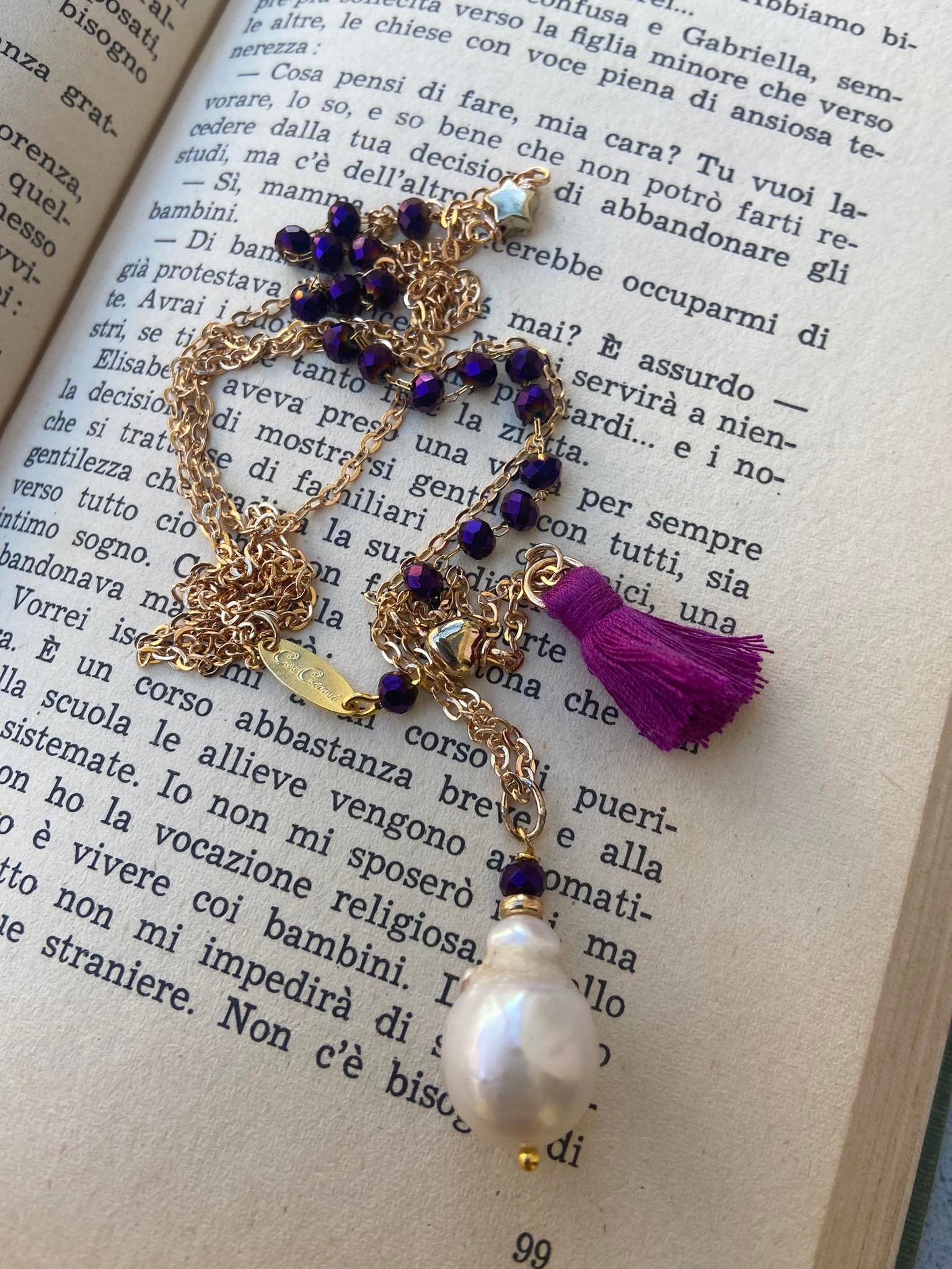 Collana sottile con pela barocca, catena di mezzi cristalli e nappina.