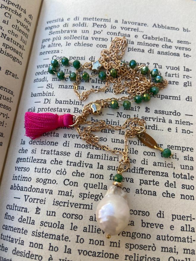 Collana sottile con pela barocca, catena di mezzi cristalli e nappina.