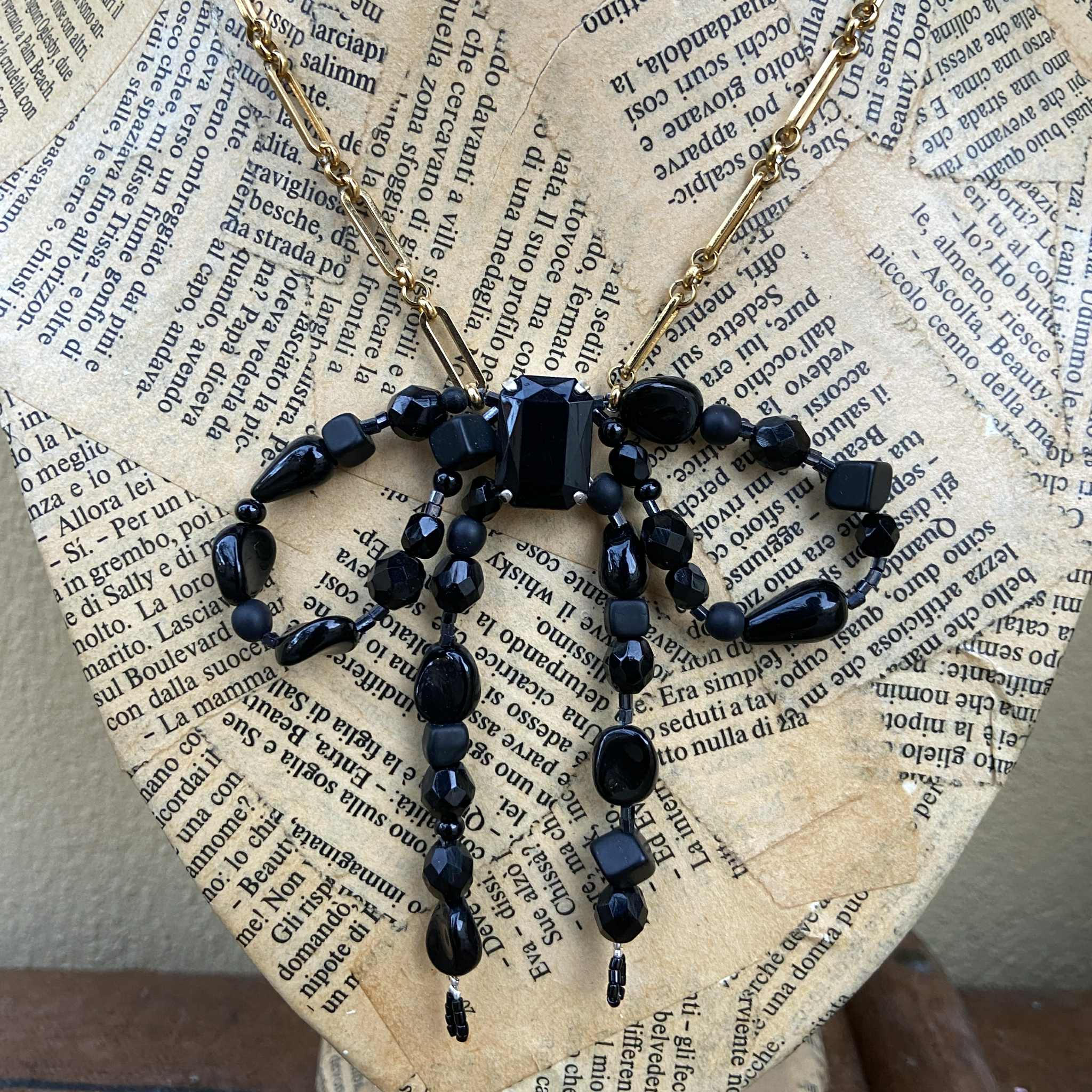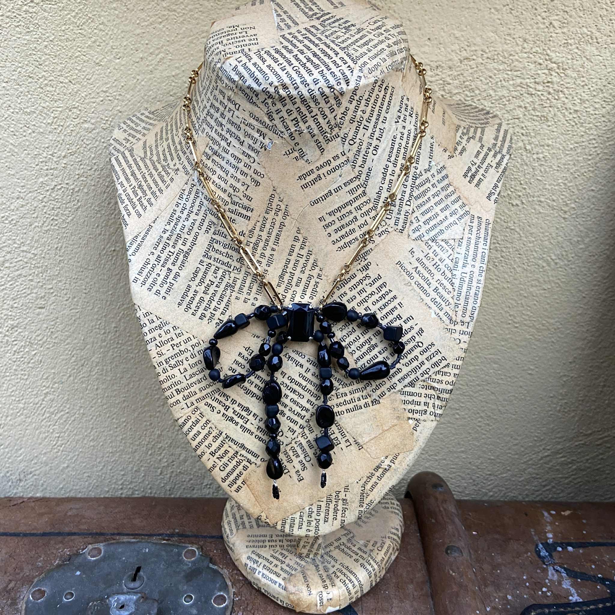 Catena liberty con fiocco in perle di vetro pressato, swarovski e mezzo cristallo. Materiali free nikel.