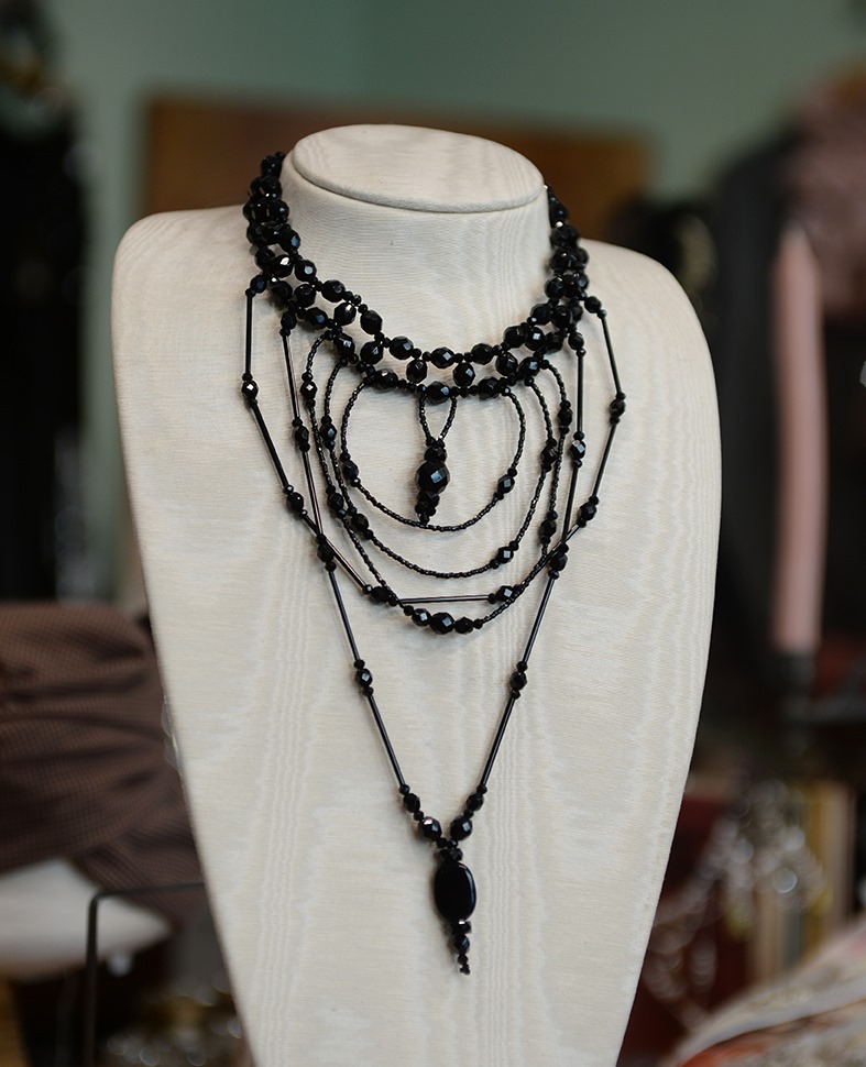 Collana con mezzi cristalli neri lavorata a intreccio, multifili. Materiali free nickel.